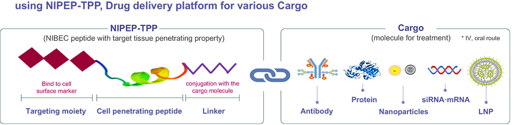 NIBEC’s technology is based on a unique peptide-delivery carrier, NIPEP-TPP (NIBEC PEPtide as Target Penetrating Peptide). This target-selective cell-penetrating carrier consists of three sections: a cell-penetrating peptide; a linker that can be joined to a cargo drug; and a targeting moiety peptide. Consequently, NIPEP-TPPs enable the creation of peptide-drug conjugates (PDCs) that, depending on the targeting moiety, can be selectively delivered to almost any specific cell or tissue with high efficiency and safety.