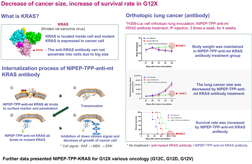 NIBEC is applying its PDC concept to various indications, including oncology. For example, the company is developing an NIPEP-TPP anti-mutant KRAS antibody that binds the G12C mutant form of human KRAS protein expressed in some lung cancers. Normally, the large size of an anti-KRAS antibody prevents it from penetrating cells, but joining it to NIPEP-TPP enables the antibody to penetrate the target cell, where it can bind mutant KRAS to decrease cancer growth. NIPEP-TPP anti-KRAS antibody decreased size of orthotopic lung cancer and increased survival rate.