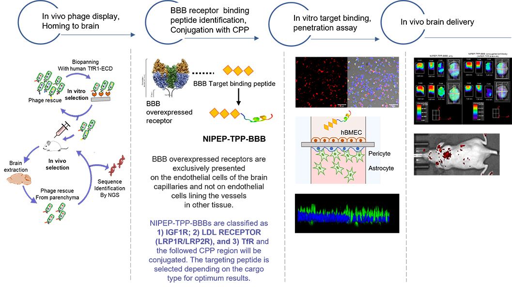 By targeting blood-brain barrier (BBB) receptors, NIPEP-TPP technology can also be used to ferry therapeutics across the BBB, offering hope to patients with notoriously difficult-to-treat Alzheimer’s disease, glioma, and other central nervous system (CNS) disorders. BBB-overexpressed receptors are exclusively presented on the endothelial cells of the brain capillaries and not on endothelial cells lining the vessels in other tissue, resulting in better delivery by the BBB-penetrating NIPEP-TPPs. Once the targeting peptide of our NIPEP-TPP-BBB interacts with one of these receptors, the CPP enables penetration, after which the cargo drug is moved to other regions by transcytosis