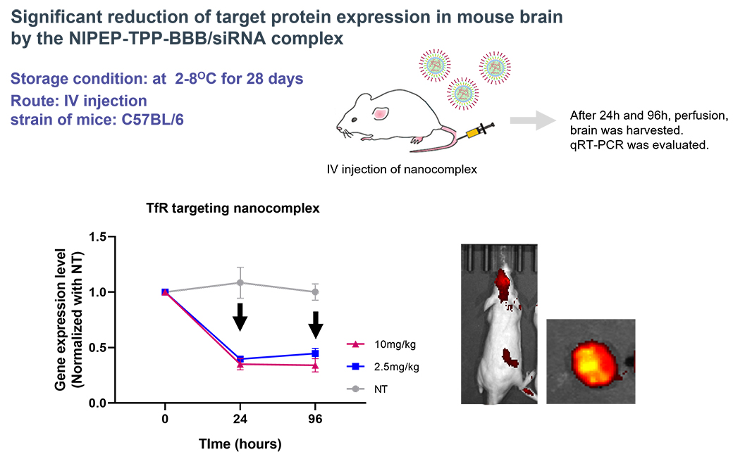 To delivery of RNA drugs, NIPEP-TPP-BBB forms a double layer nanocomplex preventing enzymatic attack during the circulation, resulting in 60-70% loading efficiency and effective gene knock down at various region of brain including cortex, midbrain, and cerebellum.