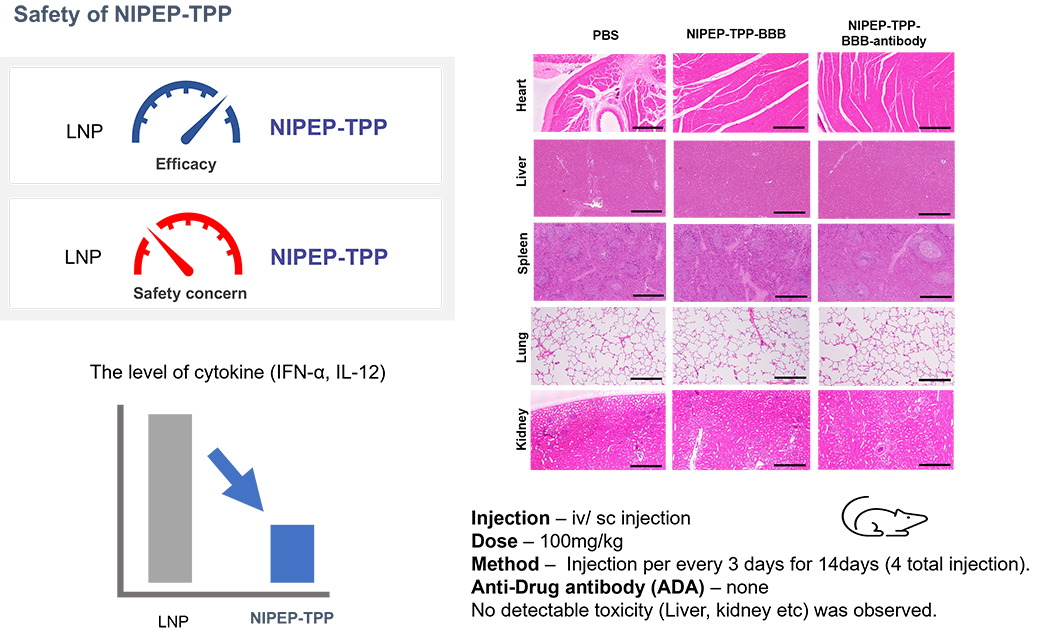 The benefit of NIPEP-TPP based PDC is that NIPEP-TPP is safe and effective compared to Lipid nanoparticles (LNP). LNP can increase anaphylaxis and level of IFN-α and IL-12 cytokine. The toxicity in major organs and ADA response was not observed upto 100mg/kg when IV/SC injected into mice.